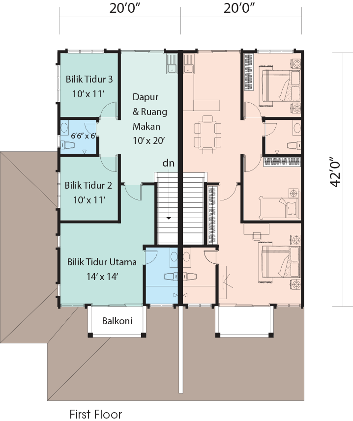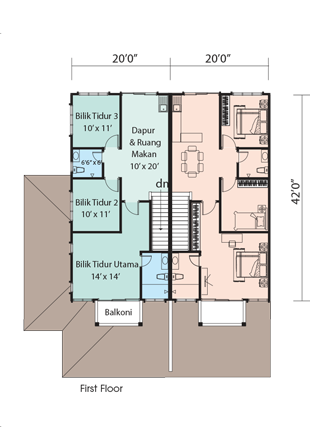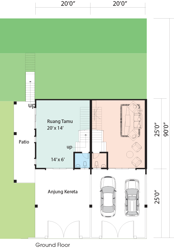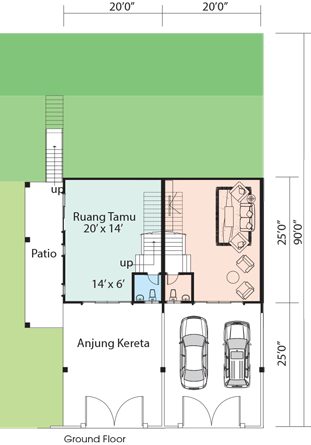 Our 1½ storey terrace homes which offer 3 bedrooms and 3 bathrooms with 20' × 90'. Each house has a car porch for two cars.