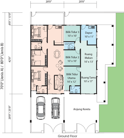 Our single storey terrace houses which offer 3 bedrooms and 3 bathrooms with varying lot sizes of 20’ x 70’ and 20’ x 80’ for the one storey houses. Each house has a car porch for two cars.